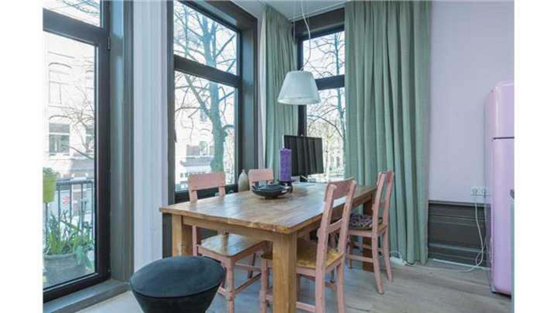 Het appartement, met een luxe open keuken die is voorzien van alle denkbare inbouwapparatuur, ligt in de populaire Frederik Hendrikbuurt, met de Jordaan op de hoek.