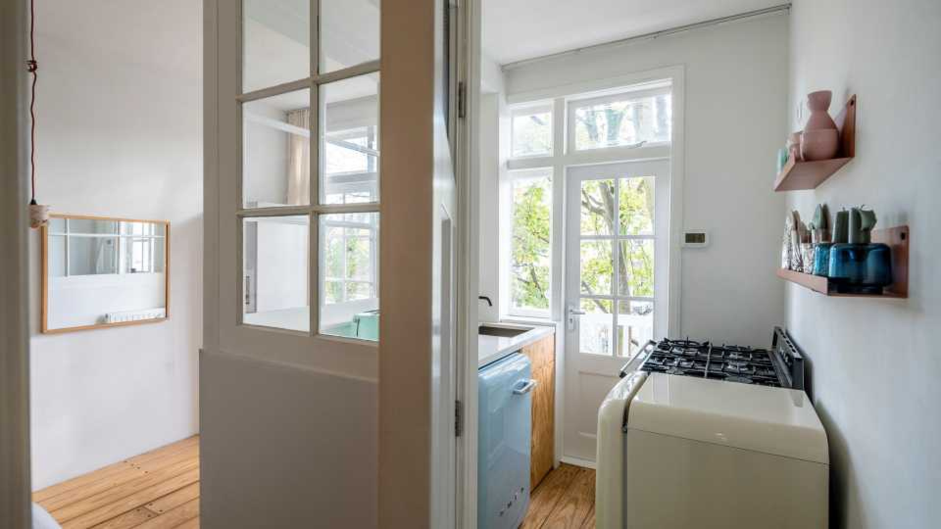 Het appartement heeft wel een balkon met uitzicht op de prachtige grachtentuinen. Buiten dat er nog een zolder is, is er ook een gemeenschappelijk dakterras. Nadeel; voor het parkeren van de auto is een vergunning van de gemeente nodig.