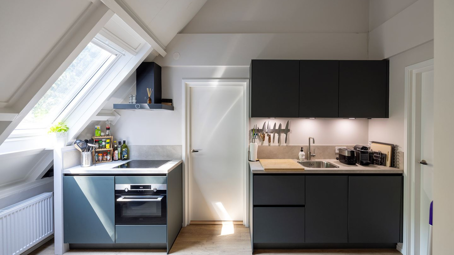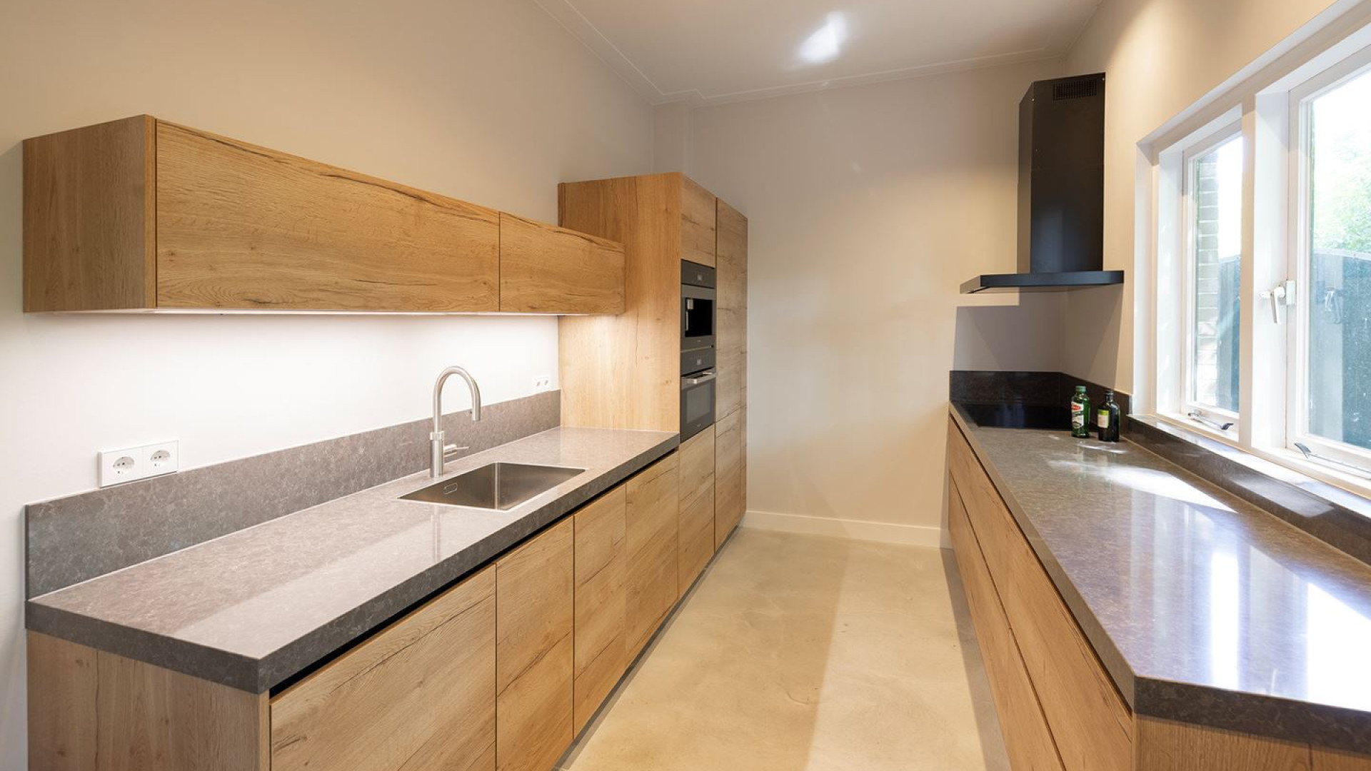 Op de tweede verdieping bevindt zich de woonruimte, eetkamer en de luxe keuken die is voorzien van diverse inbouwapparatuur plus twee ruime slaapkamers. Ook een dakterras ontbreekt niet. Parkeren kan op het eigen terrein.